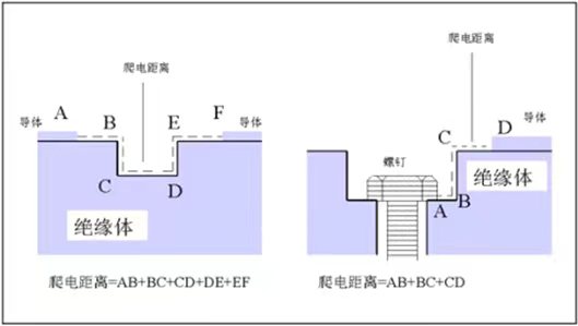 或一個導(dǎo)電部件與器具的易觸及表面之間沿絕緣材料表面之間的最短路徑。